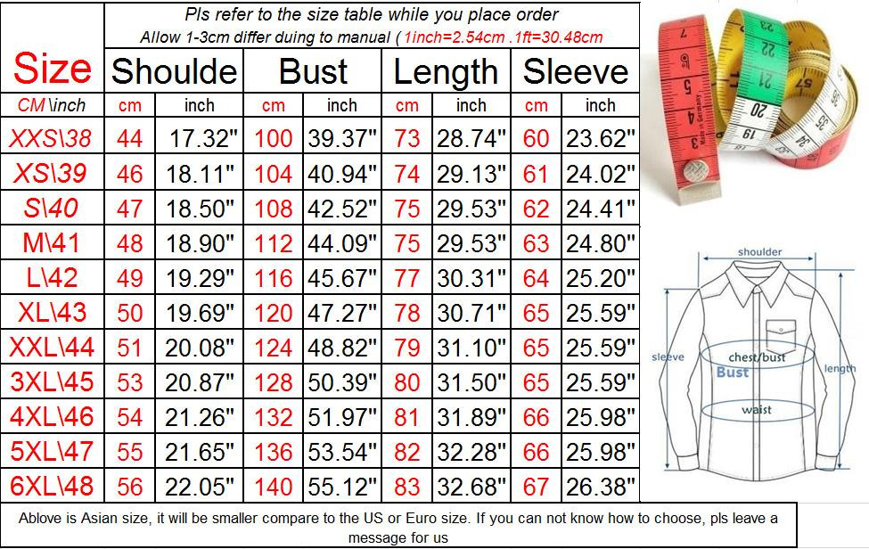 | Size | S (46)M (48)L (50)XL (52)XXL (54)3XL (56)4XL (58) |