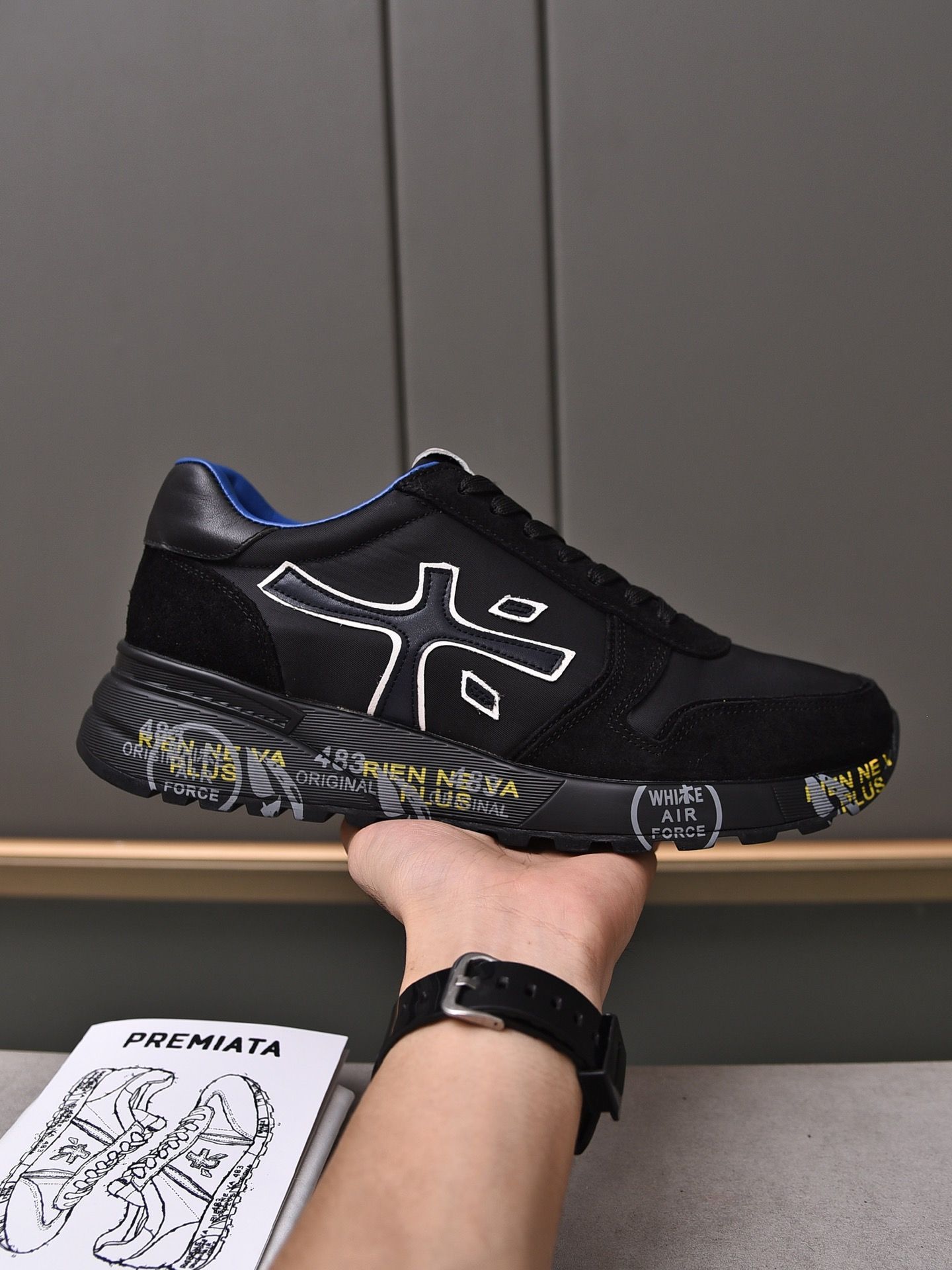 Details like textured mesh, perforated stripes and checkerboard laser cutouts blend classic jogger motifs with modern dimension. Multi-finish leather mixes matte and shine.