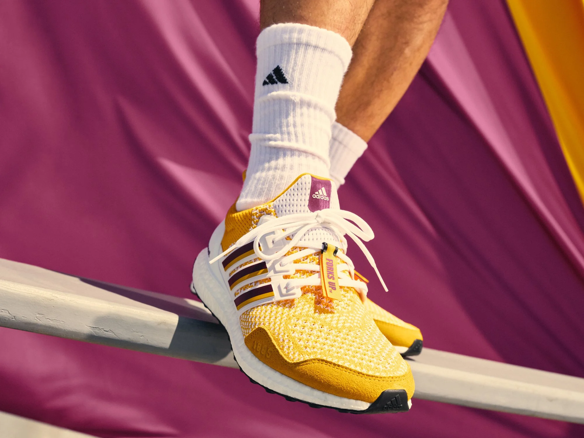 The first ASU Ultraboost shoe collaboration released in August 2018. Adidas and ASU dropped 500 pairs exclusively at the Sun Devils’ student store. The shoes sold out almost instantly. Due to the massive demand, Adidas replenished stock and later released the ASU Ultraboost more widely online and at select retailers. Additional colorways like a black/gold “Forks Up” edition and white/maroon “Sparky” version released in 2019 and 2020.