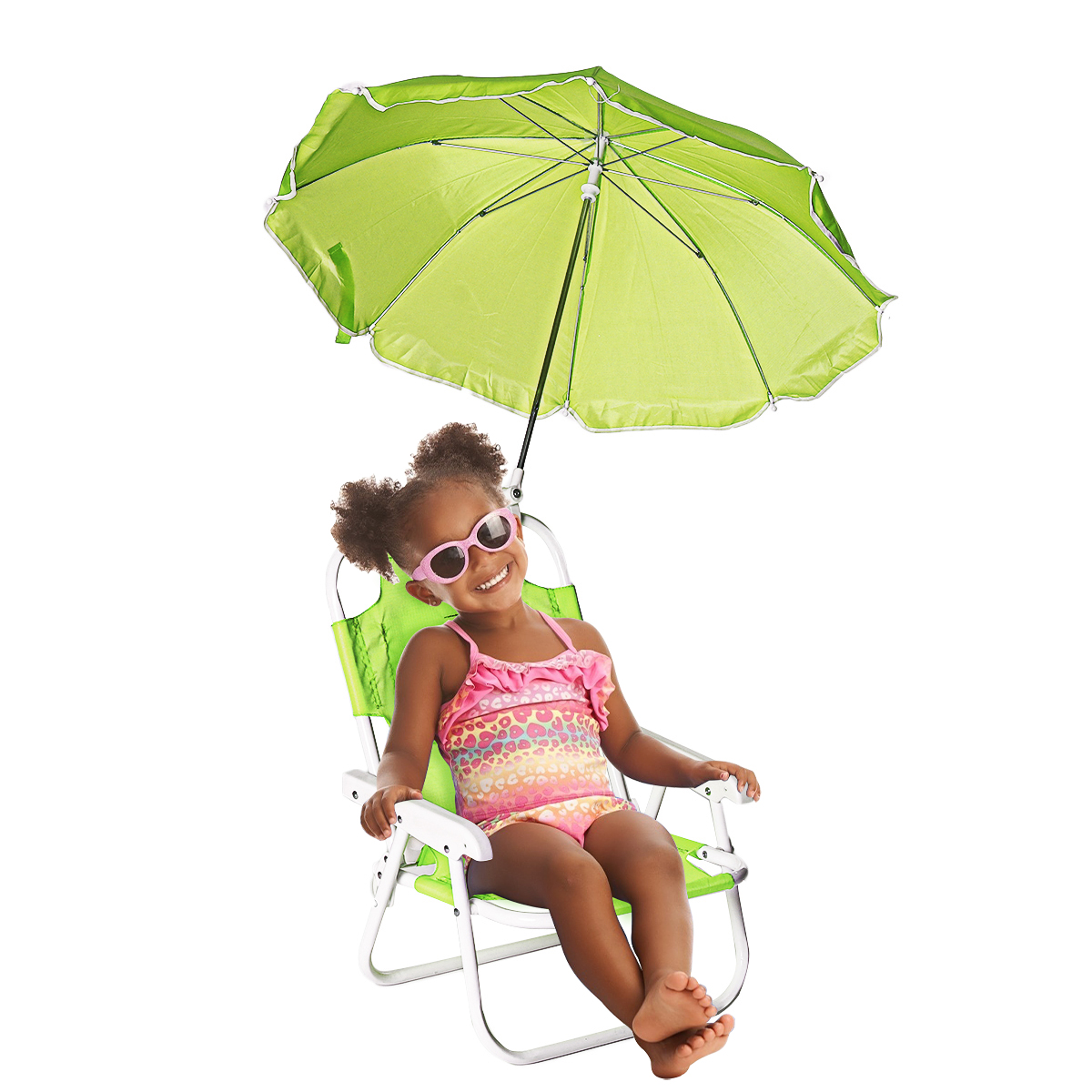 An umbrella or sun shade attachment for a basic reclining chair costs $30 – $75. So that adds up to $100 – $150 total for the chair plus shade accessory purchased separately.