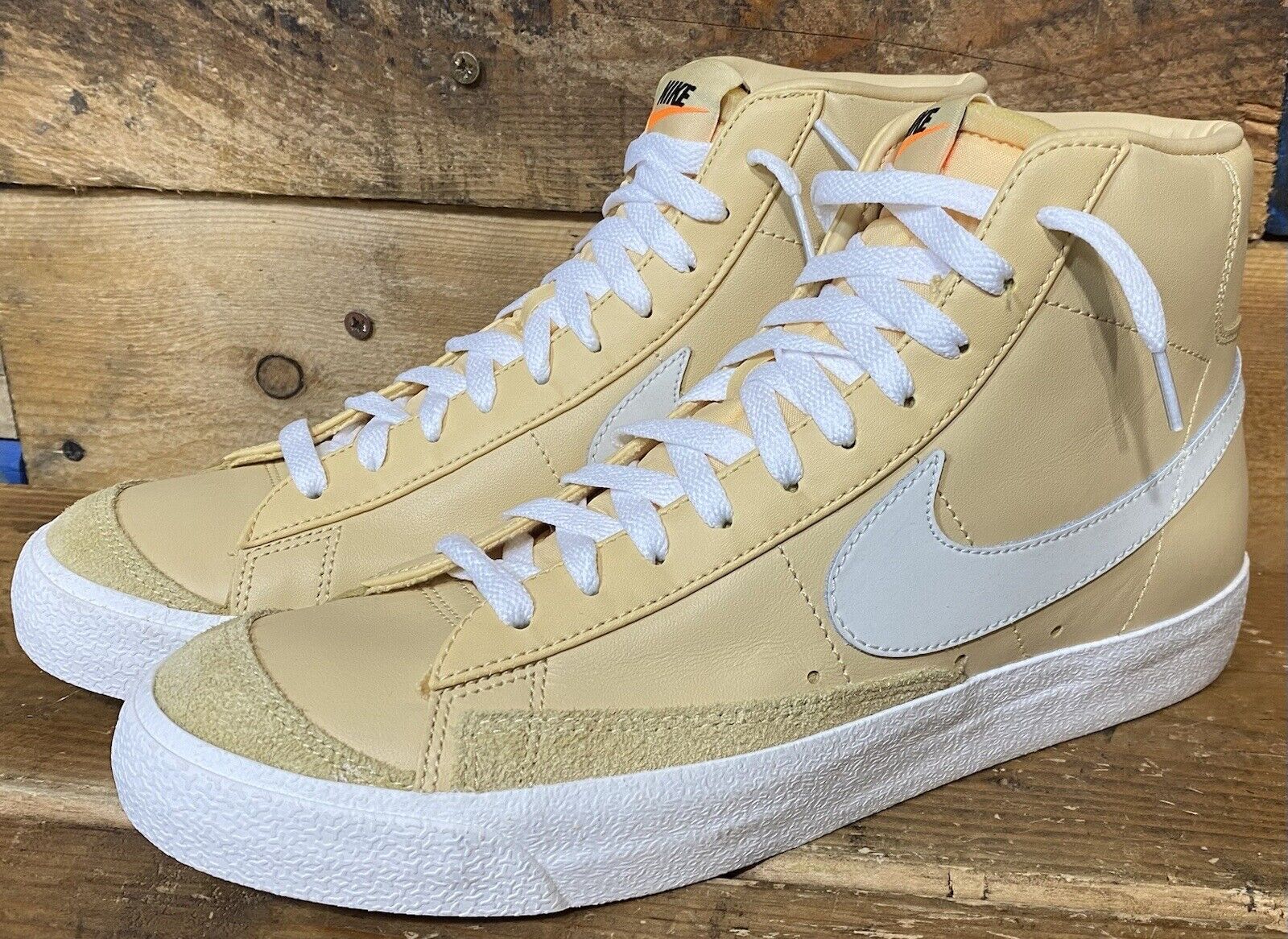 When looking to buy a pair of vintage Nike Blazer Mid 77s, carefully inspect the condition. Check for scuffs, stains, creases, tears, markings, or damage on the upper, sole, lining, tongue, and laces. Examine the foam midsole for crumbling or cracks, the outsole for excessive wear, and the overall shape of the shoe. Original Nike branding and logo details should still be visible and not overly faded. Size, date, and production codes stamped inside the tongue can help verify authenticity.