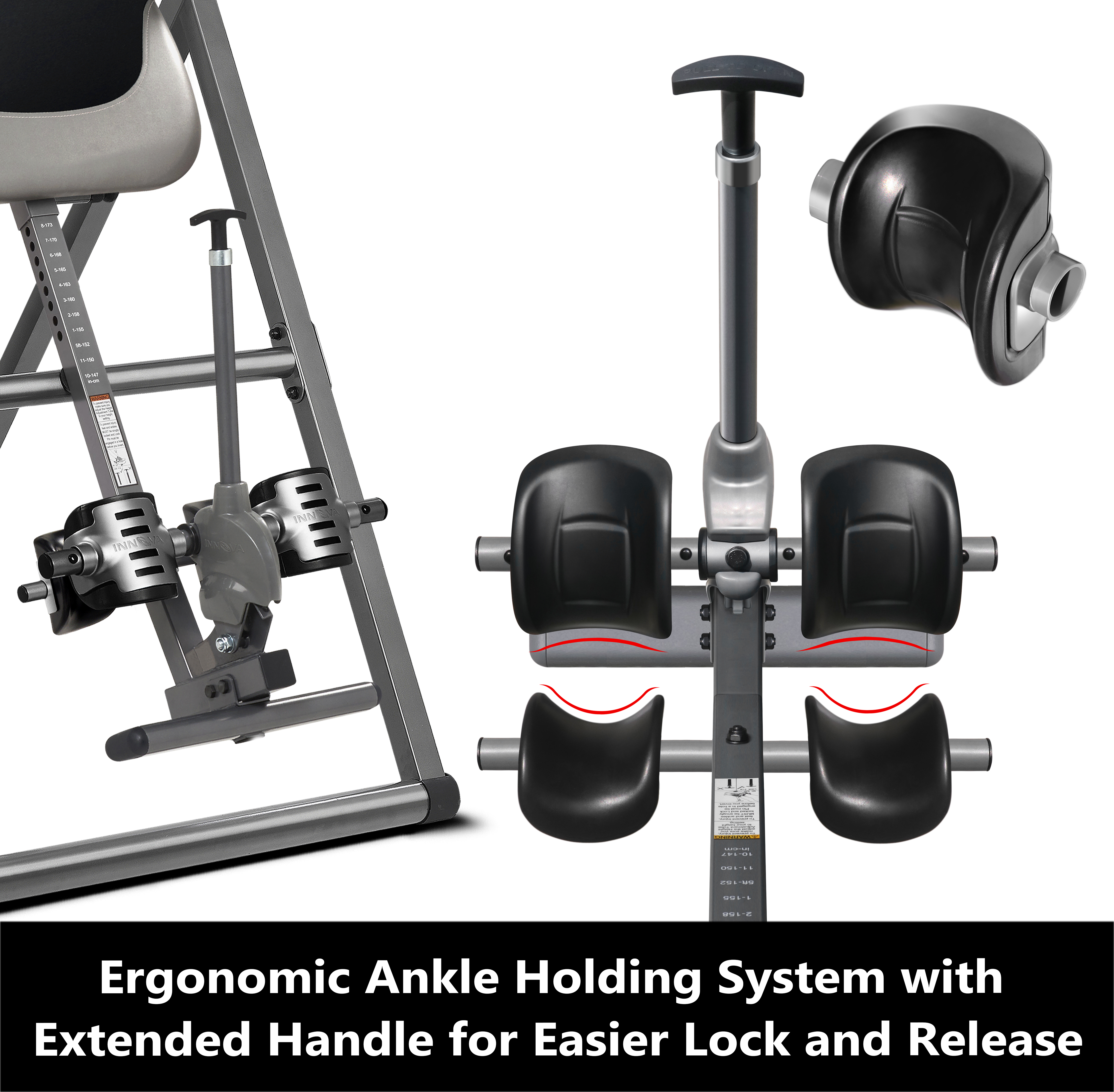 A major perk of the Health Gear Deluxe model is the adjustability and customization available. This allows users of different heights to find their optimal settings for comfort and decompression effects. The ankle locks are padded for security and slide up/down to accommodate heights from 4’10” up to over 6’.
