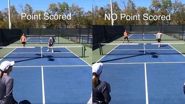 Only the team serving can score points. The server initiates play from the right side service court. The ball must clear the non-volley zone and land within the diagonal service court. The receiver returns the serve from the right side.